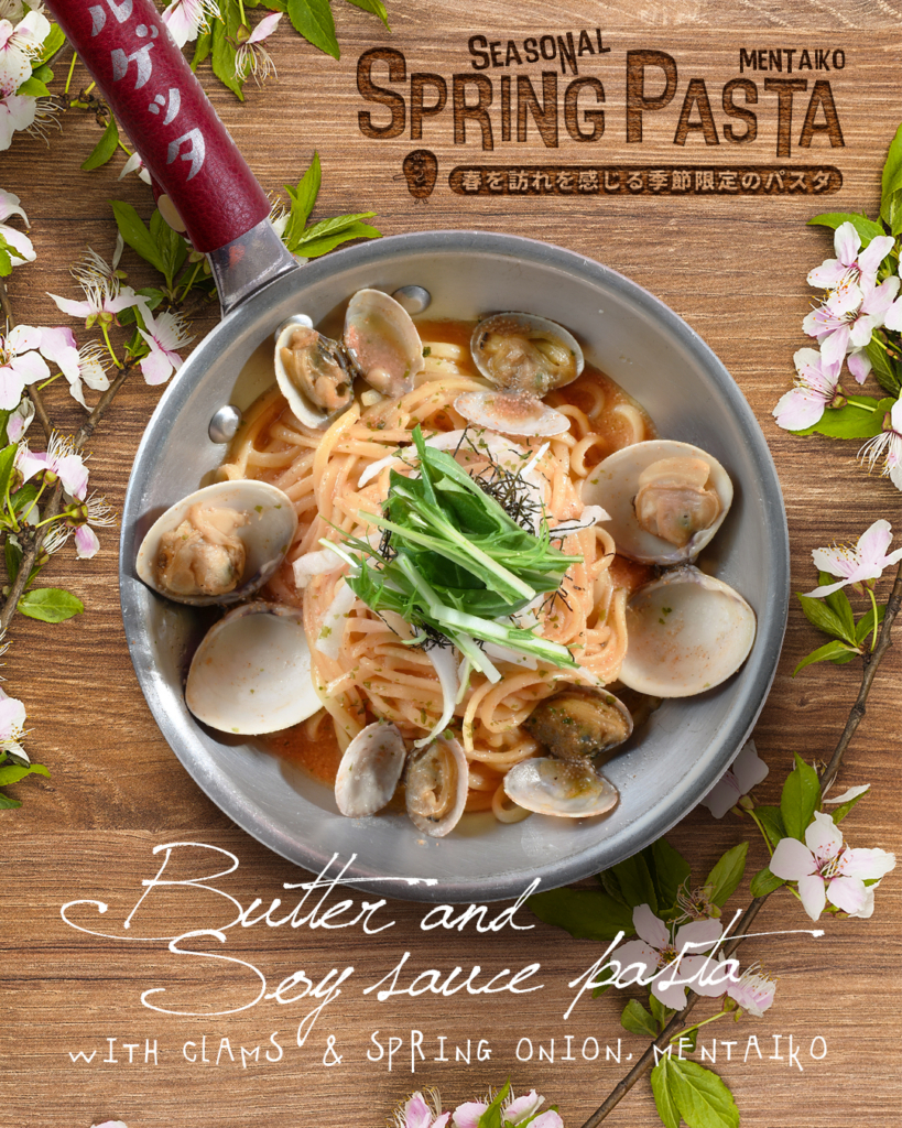 はまぐりと浅利の貝のエキスをぎゅっと閉じ込め、明太子 × バター × 醤油 で仕上げました。和風ソースが2種の貝の出汁と重なり合い、濃く深い味わいに!口いっぱいに広がる春の潮の香りが楽しめるパスタです。1,380円(税込)