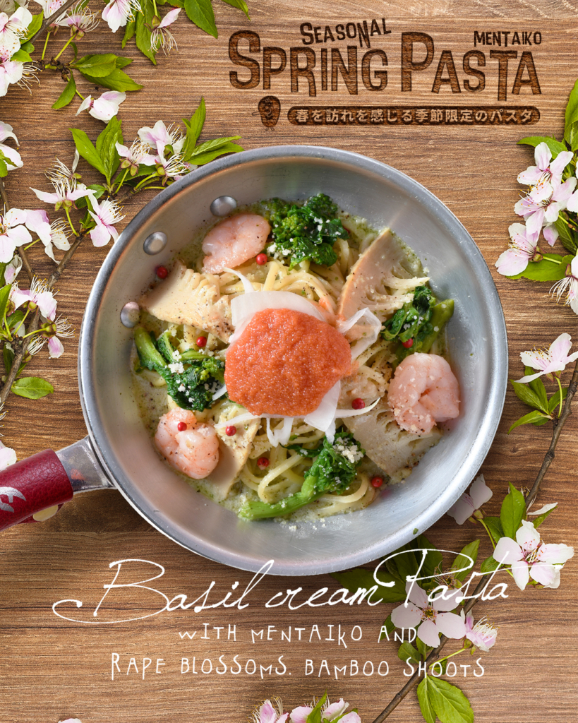 香り高いバジルクリームやバター醤油、レモン風味のペペロンチーノ等、春を彩る食材と明太子を使ったパスタ3種、季節限定のピザや夜限定のアヒージョ等もご用意しております。