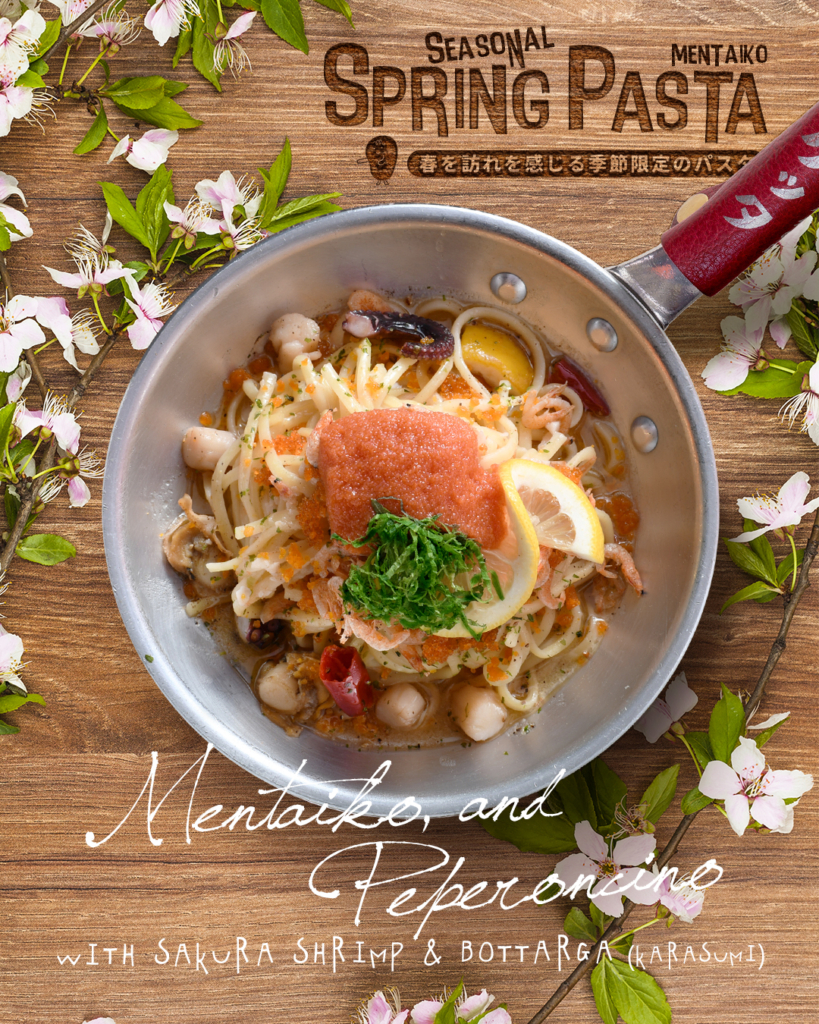 香ばしい桜海老と濃厚なカラスミを贅沢に合わせた大人の春パスタ。ペペロンベースにレモンを効かせて、後味はさっぱり爽やかに。仕上げにプチプチ食感のとびっ子と明太子、さらに大葉の香りがGOODな一品に仕上がりました。1,480円(税込)